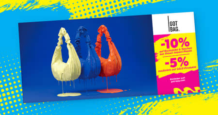 10% Ersparnis 3 weitere GutscheineStylisch und verantwortungsvoll: Bei GOT BAG gibt's Rucksäcke, Taschen u.v.m. aus recyceltem Ocean Impact Plastic. Mit Studentenrabatt aus dem neuen Gutscheinheft holst du dir 10% Nachlass auf das gesamte Sortiment!
